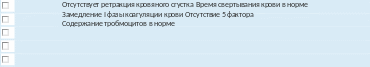 Правильныеответы:Содержаниетробмоцитоввнорме,Времясвертываниякровивнорме,ЗамедлениеIфазыкоагуляциикрови, Отсутствие5 фактора