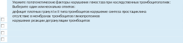 Отзыв Правильные ответы: отсутствие в мембранах тромбоцитов гликопротеинов, дефицитплотныхгранулIиIIтипатромбоцитов,нарушенияреакциидегрануляциитромбоцитов |