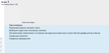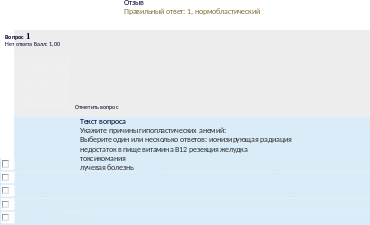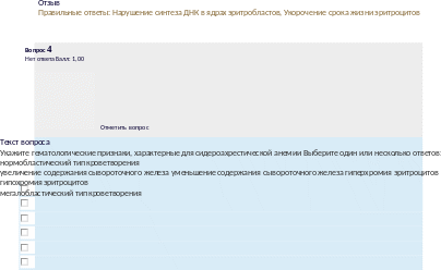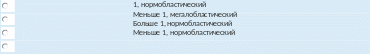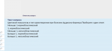 Текствопроса Укажитегематологическиепоказатели,характерныедляжелезодефицитныханемийВыберитеодинилинесколькоответов: цветовойпоказатель-1,2 эритроциты-1,2х10/л,Нв-50г/л ретикулоциты периферической крови-2%анизоцитоз с преобладанием микроцитовэритроциты-3х10/л, Нв-60г/л ретикулоциты периферической крови менее 0,2%эритроцитыстельцамиЖолливпериферическойкровицветовой показатель-0,66 анизоцитозспреобладаниеммакроцитов |