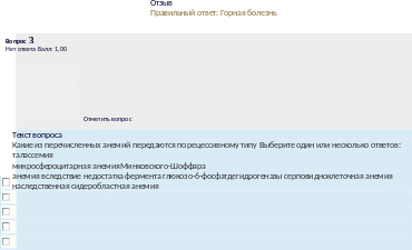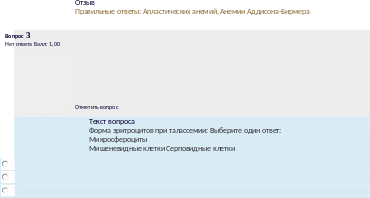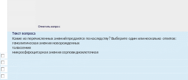 Отзыв Правильныеответы:микросфероцитарнаяанемия,талассемия,серповидноклеточная |
