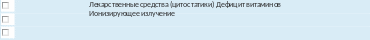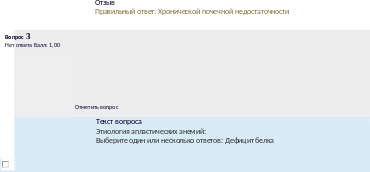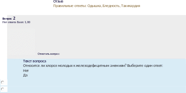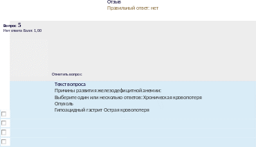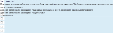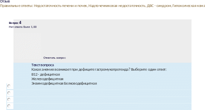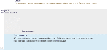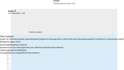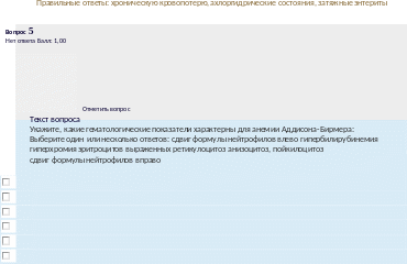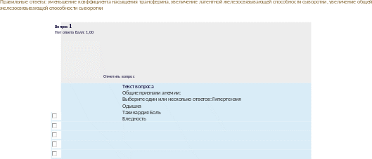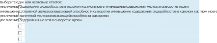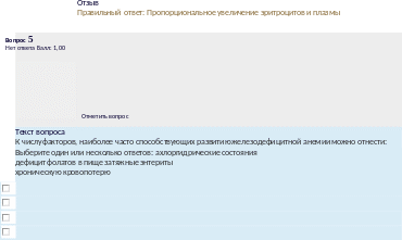 Текствопроса Кчислуфакторов,наиболеечастоспособствующихразвитиюжелезодефицитнойанемииможноотнести: Выберитеодинилинесколькоответов:затяжныеэнтериты дефицит фолатов в пищехроническуюкровопотерю ахлоргидрическиесостояния |