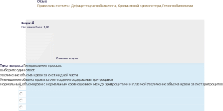 Текствопроса Нормоволемияолигоцитемическая: Выберитеодинилинесколькоответов: Большинствоанемий Нормальный объем крови с уменьшением эритроцитов в единице объемаНормальный объем крови с увеличением эритроцитов в единице объемаУвеличениеобъемакровиснормальнымсоотношениемэритроцитовиплазмы Нормальныйобъемкровиснормальнымсоотношениемплазмыи эритроцитов |