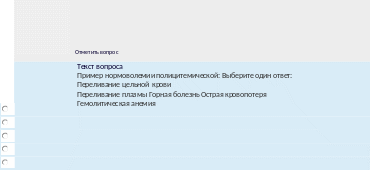 Текствопроса Примерполицитемическойгиповолемии: Выберитеодинилинесколькоответов:Горнаяболезнь Обширные ожогиТоксическая диспепсияГемолитическаяанемия Остраякровопотеря |