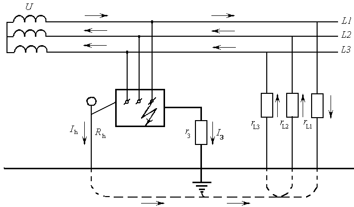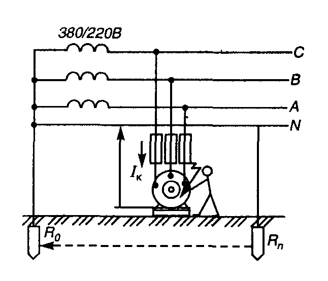 Заземлитель — это проводник или совокупность металлически соединенных проводников, находящихся в соприкосновении с землей или ее эквивалентом ( бывают искусственные, предназначенные исключительно для целей заземления, и естественные — находящиеся в земле металлические предметы иного назначения). Для заземления оборудования в первую очередь используют естественные заземлители: железобетонные фундаменты, а также расположенные в земле металлические конструкции зданий и сооружений. Защитное заземление применяют в сетях напряжением до 1000 В с изолированной нейтралью и в сетях напряжением свыше 19000 В как с изолированной, так и с заземленной нейтралью. С помощью защитного заземления уменьшается напряжение на корпусе относительно земли до безопасного значения, следовательно, уменьшается и сила тока, протекающего через тело человека. На схеме защитного заземления показано, что напряжение, приложенное к телу человека в случае прикосновения к оборудованию, можно снизить, уменьшая сопротивление заземляющего устройства. Согласно ПУЭ, сопротивление заземления в электроустановках до 1000 В не должно превышать 4 Ом.