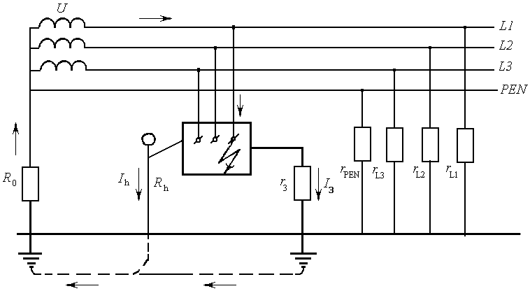 Зануление обеспечивает защиту от поражения электрическим током при замыкании на корпус за счет ограничения времени прохождения тока через тело человека и за счет снижения напряжения прикосновения.