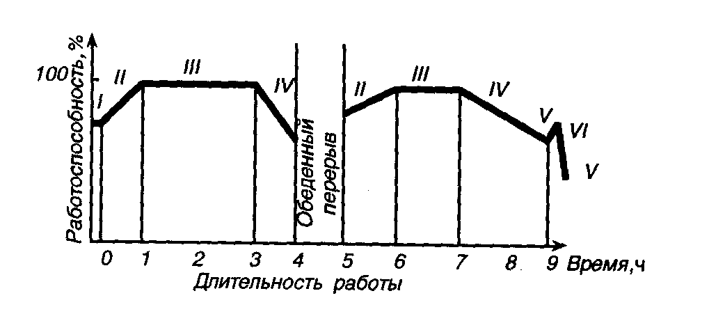 1. Интенсивностью работы. Чем больше интенсивность, тем короче период устойчивой работоспособности.