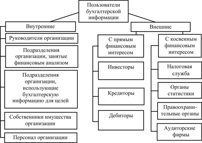 формирование полной и достоверной информации о деятельности организации и ее имущественном положении, необходимой внутренним пользователям бухгалтерской отчетности — руководителям, учредителям и собственникам имущества организации, а также внешним — инвесторам, кредиторам и др.;