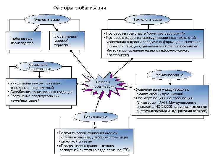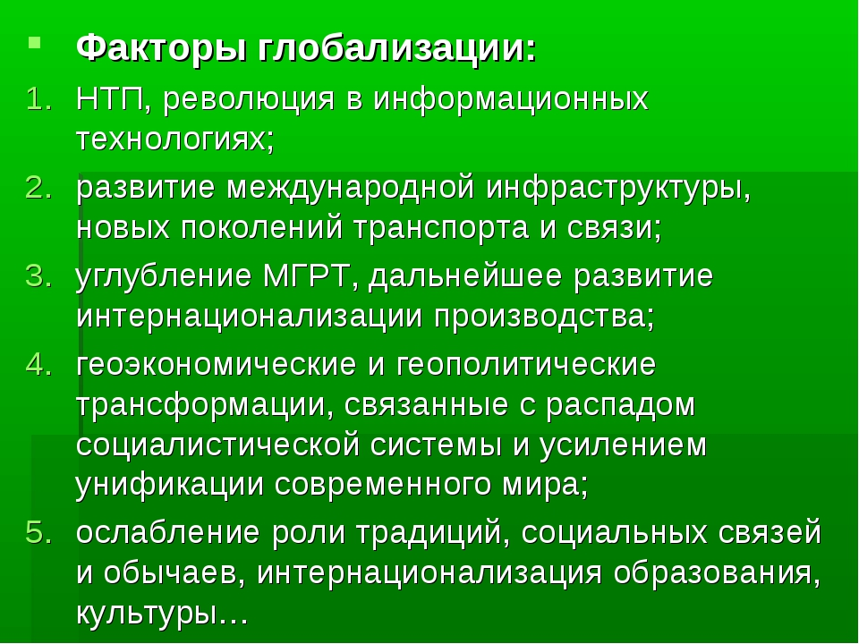 1. Экономический – огромная концентрация и централизация капитала, рост мощи международных корпораций, интенсификация международной специализации производства и кооперации, международный маркетинг, электронная торговля, международная логистика.