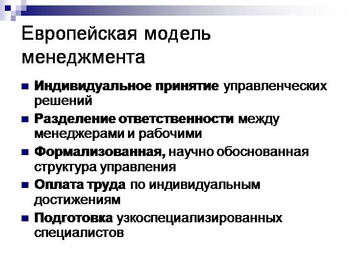 Европейская модель менеджмента имела значительные отличия от японской и американской моделей. Модели Японии и США достаточно жестко подходили к вопросам управления персоналом. Европейские страны, напротив, интенсивно развивали принципы менеджмента, в соответствии с которыми каждый сотрудник мог принять определенную роль в процессе управления.