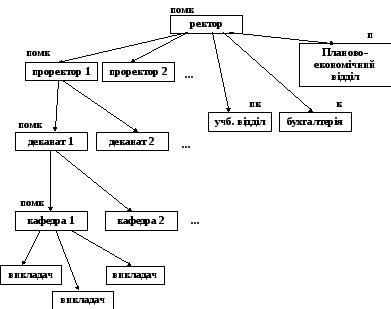 Підрозділи яким делегуються усі функції управління являються лінійними підрозділами (ректорат, деканати, кафедри), а яким тільки деякі – функціональними (бухгалтерія, учбовий відділ, планово-економічний відділ). Таким чином структура являється лінійно-функціональною. Кількість людей у підрозділах можна визначити спираючись на норму управління, не більше 14 робітників.
