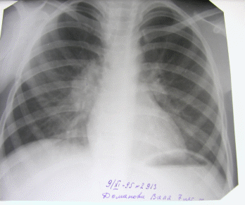Объективно: Ребенок отстаёт в физическом развитии. Кожные покровы бледные. Пальпируются шейные и подмышечные лимфатические узлы мягко-эластичной консистенции, безболезненные, около 1 см в диаметре. ЧДД 16 в минуту, в межлопаточном пространстве справа определяется притупление перкуторного звука, дыхание везикулярное, хрипов нет. ЧСС 104 в минуту, тоны сердца ясные, ритмичные. Живот мягкий, безболезненный.