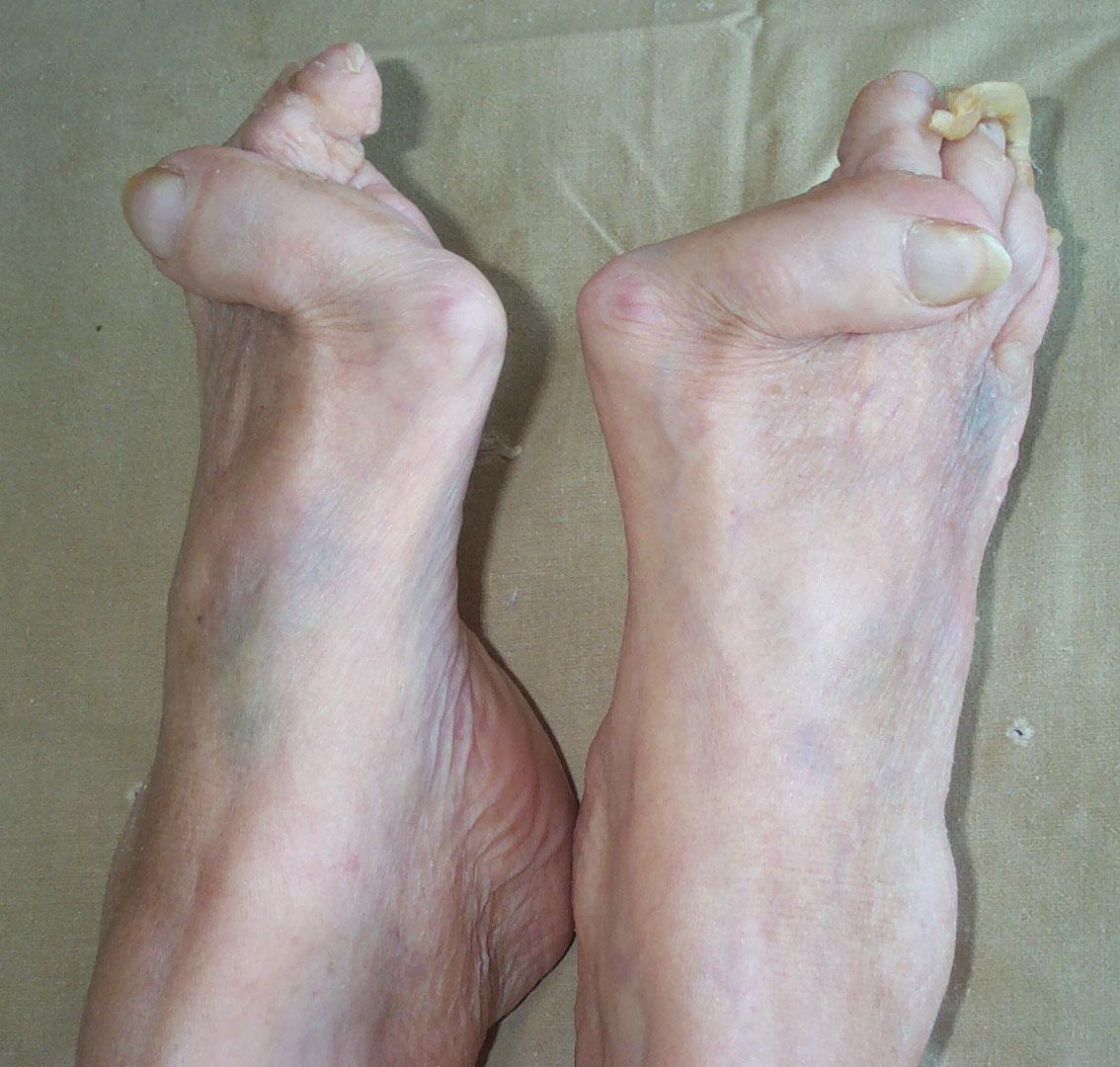 Больной С., 41 года, работает длительное время грузчиком мясокомбината. При опросе предъявляет жалобы на боли в нижних конечностях, иррадиирущие в бедра, голени, боли усиливаются во второй половине дня, к вечеру отмечается умеренная отечность мягких тканей тыла стопы. При осмотре: выраженные отклонения первых пальцев обеих стоп кнаружи, боли при ходьбе и в положении стоя, припухлость передних отделов стоп, на подошвенной поверхности стоп – натоптыши. Имеются сгибательные и разгибательные контрактуры суставов пальцев. Носит широкую обувь, на 1-2 размера больше обычной, боли усиливаются к смене погоды, сезона, смене обуви, при прыжках и беге. Иннервация и кровоснабжение конечностей не нарушены.