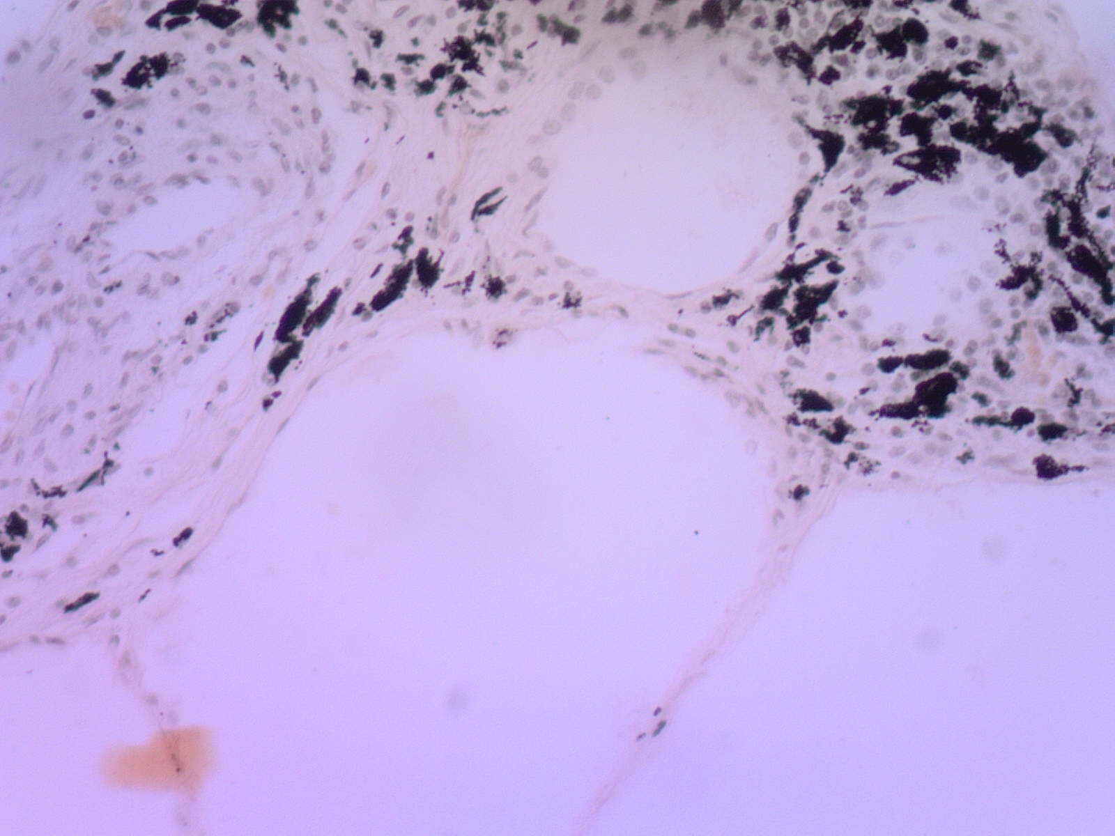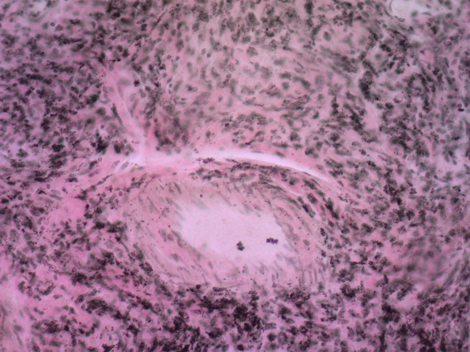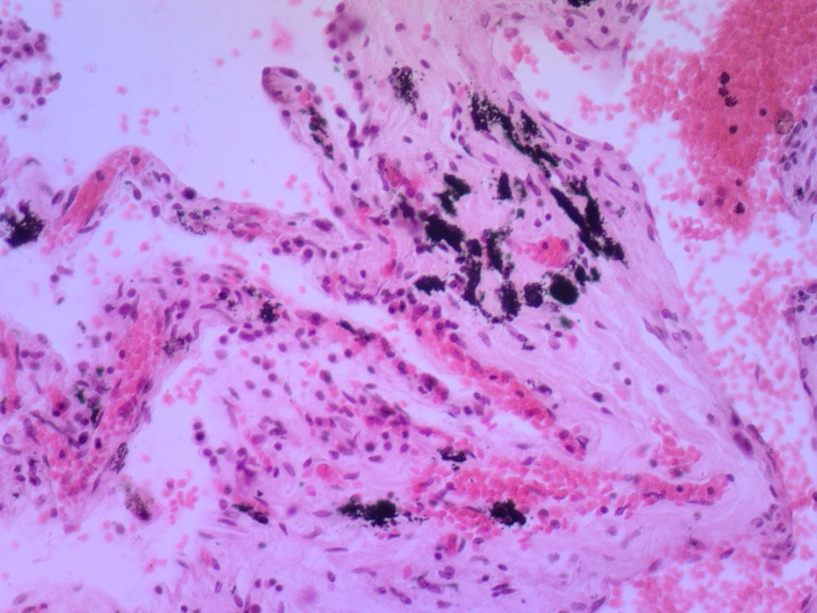 Визуально в срезе легкого отметить очаговые образования бледно-розового цвета. Это силикотические узелки. На малом увеличении в этих узелках определяются бледная кварцевая пыль и коллагеновые волокна розового цвета, идущие в различных направлениях, вихреобразно. Отмечается перибронхиальный и периваскулярный склероз. Альвеолы эмфизематозно изменены. В легком много угольного пигмента.