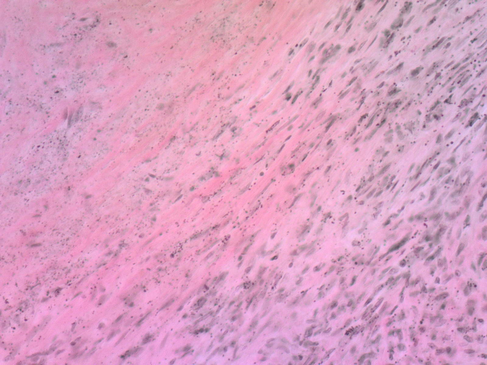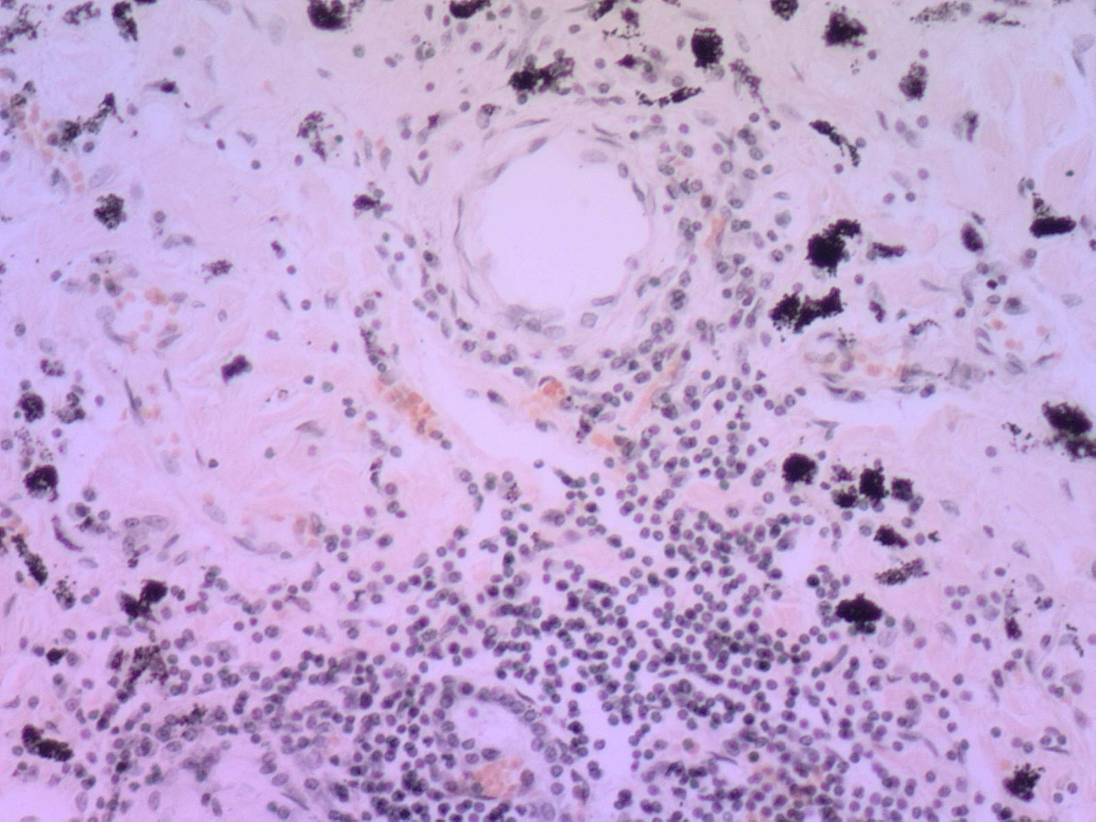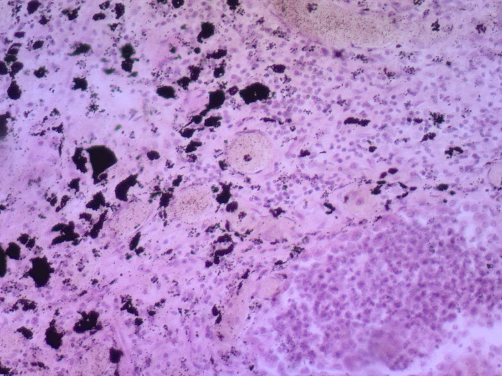 Визуально в срезе легкого отметить очаговые образования бледно-розового цвета. Это силикотические узелки. На малом увеличении в этих узелках определяются бледная кварцевая пыль и коллагеновые волокна розового цвета, идущие в различных направлениях, вихреобразно. Отмечается перибронхиальный и периваскулярный склероз. Альвеолы эмфизематозно изменены. В легком много угольного пигмента.