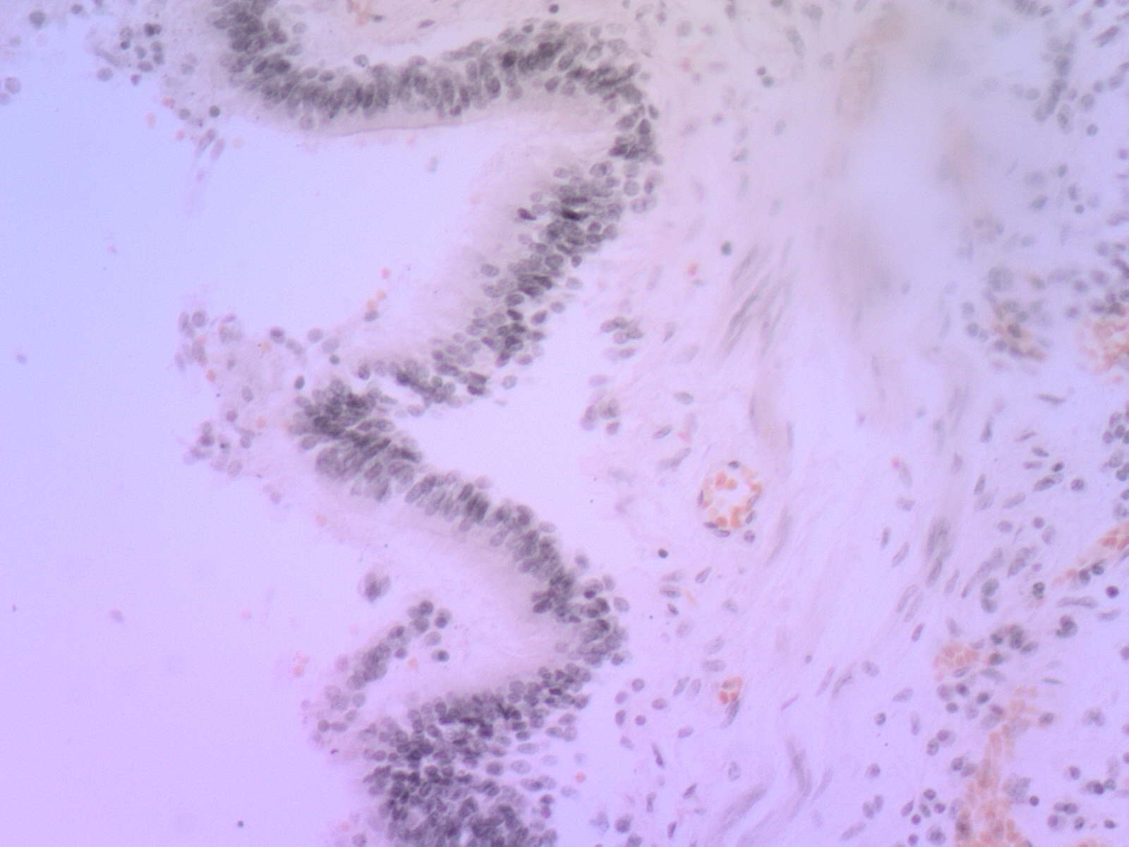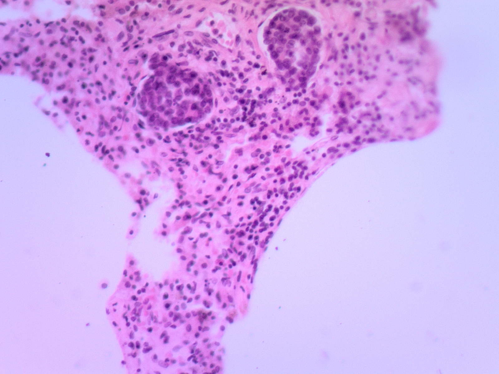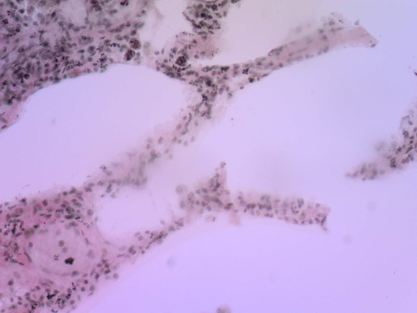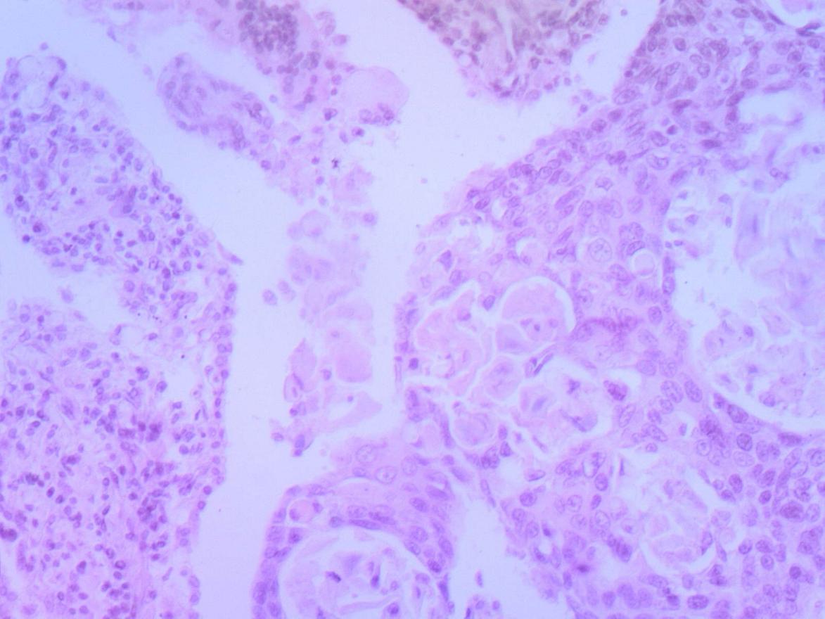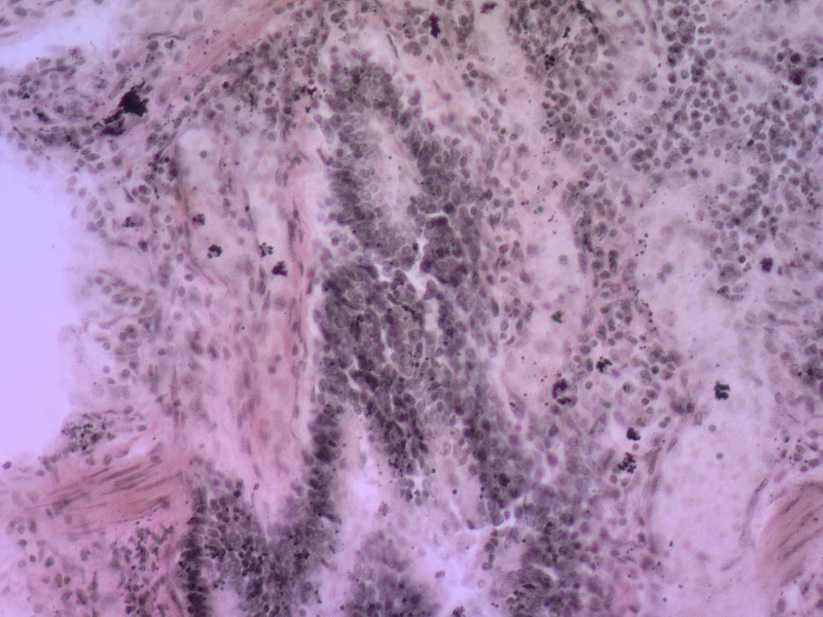 В препарате резко изменена гистоструктура легкого. Просвет бронхов расширен. Эпителиальная выстилка утолщена. На большем увеличении видно, что эпителиальные клетки, выстилающие бронхи, гиперхромные, расположены в несколько рядов, местами эпителий напоминает многослойный плоский. Эта перестройка цилиндрического эпителия бронхов называется плоскоклеточной метаплазией. В остальных участках определяются комплексы опухолевой ткани, клетки которой напоминают клетки шиповатого слоя плоского эпителия. В отдельных опухолевых гнездах в центре лежат розовые концентрические структуры, которые образуются из ороговевающих клеток. Это раковые «жемчужины».