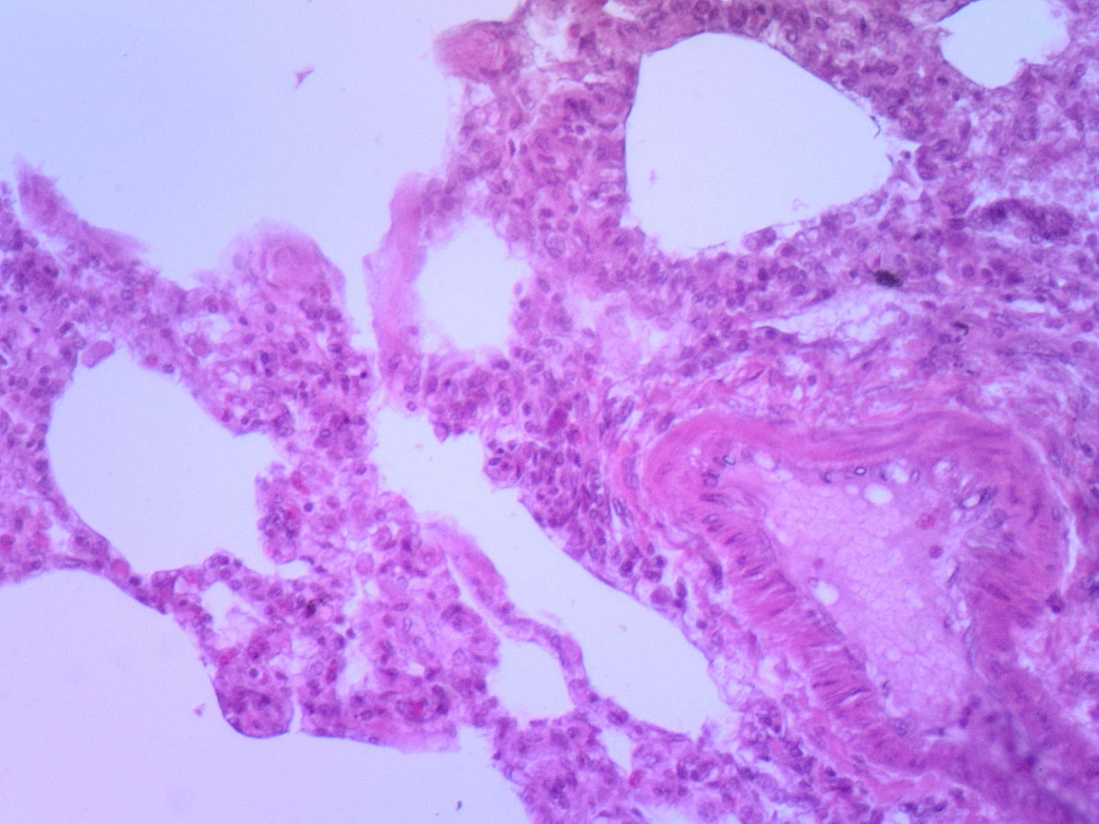 Стенки бронхов и межальвеолярные перегородки утолщены за счет соединительной ткани, определяются очаги эмфиземы. Резкое полнокровие сосудов микроциркулярного русла. Бронхи гофрированы (спазмированы), железы в состоянии гиперсекреции. Стенки бронхов и межальвеолярных перегородок инфильтрированы эозинофилами, базофилами лимфоцитами, плазматическими клетками. В просвете бронхов и альвеол слоистый секрет, эозинофилы, лимфоциты, плазматические клетки.