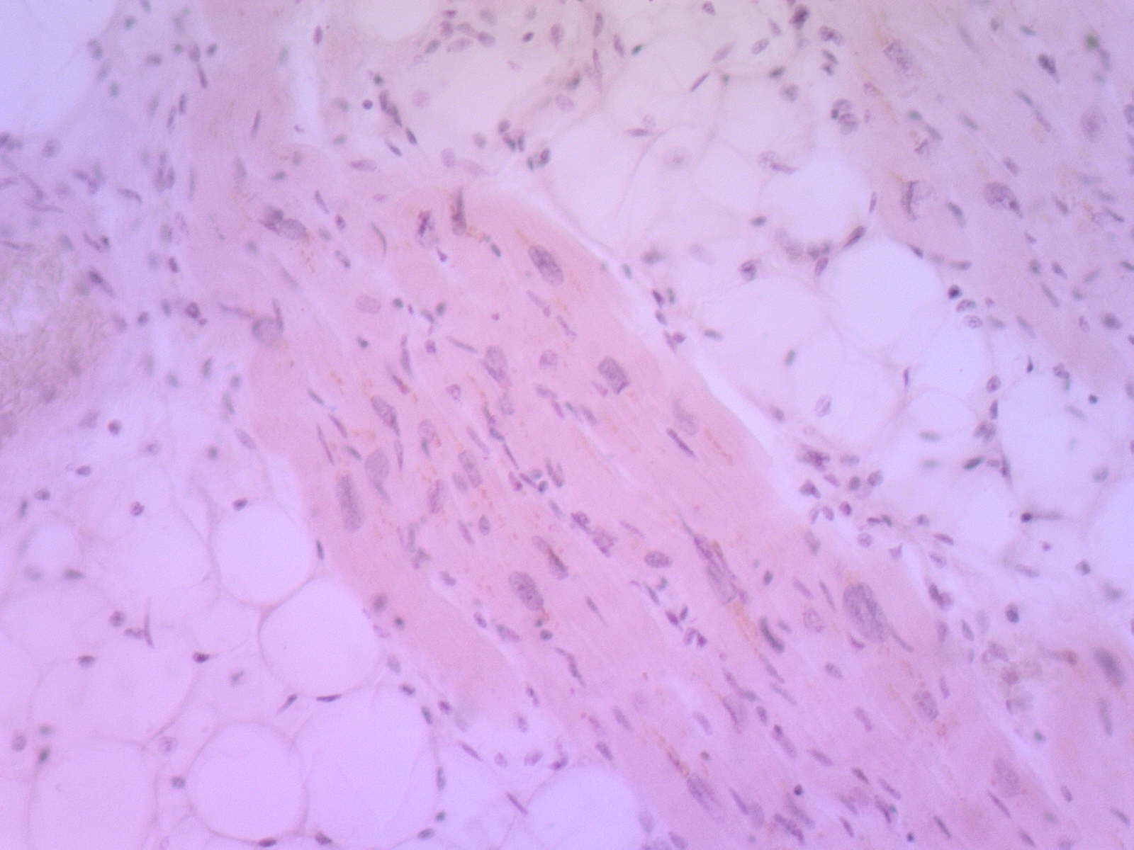 Подэпикардиальный слой жировой ткани выражен. Поля и небольшие скопления жировых клеток лежат и в глубине мышечного слоя. Мышечные пучки, расположенные среди жировой ткани, состоят из истонченных (атрофированных) миоцитов. Разросшаяся жирован ткань прослеживается и по ходу соединительнотканных прослоек.