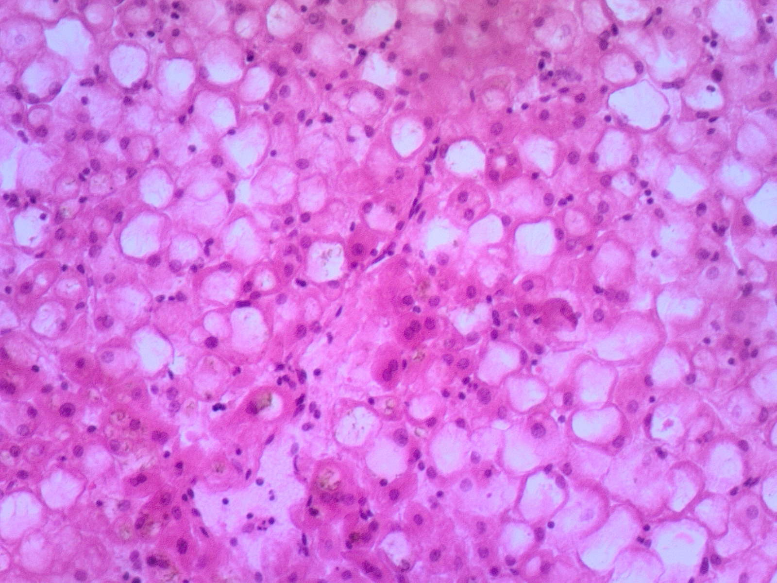 Видны многочисленные гепатоциты с «пустой» (вакуолизированной) цитоплазмой. Это ожиревшие печеночные клетки. Округлые пустоты, распределенные в печеночных дольках неравномерно,— это места локализации цитоплазматического жира, который растворился при обработке среза во время его изготовления. При большем увеличении — вакуоли лежат в цитоплазме гепатоцитов, ядра клеток оттеснены на периферию.
