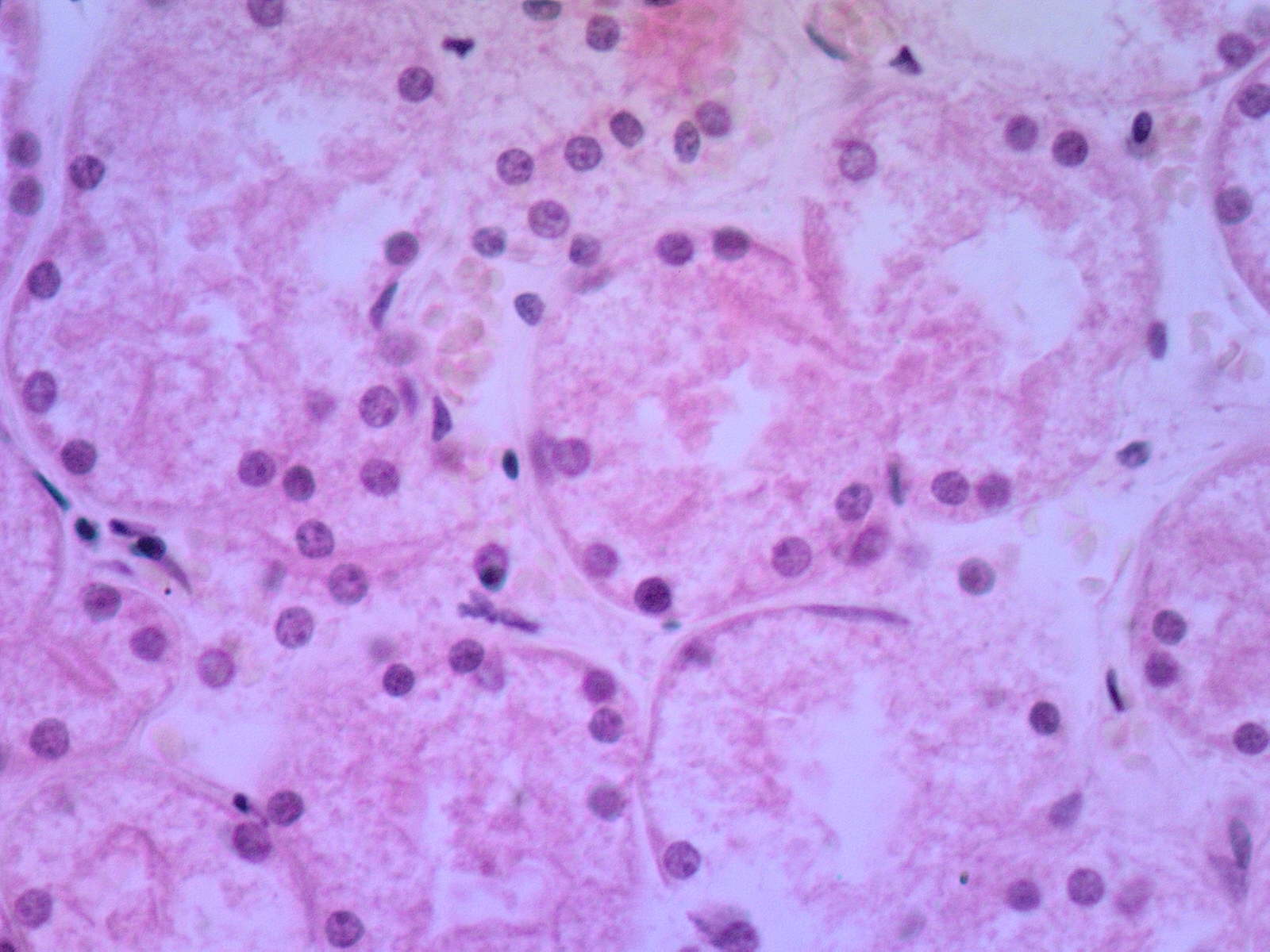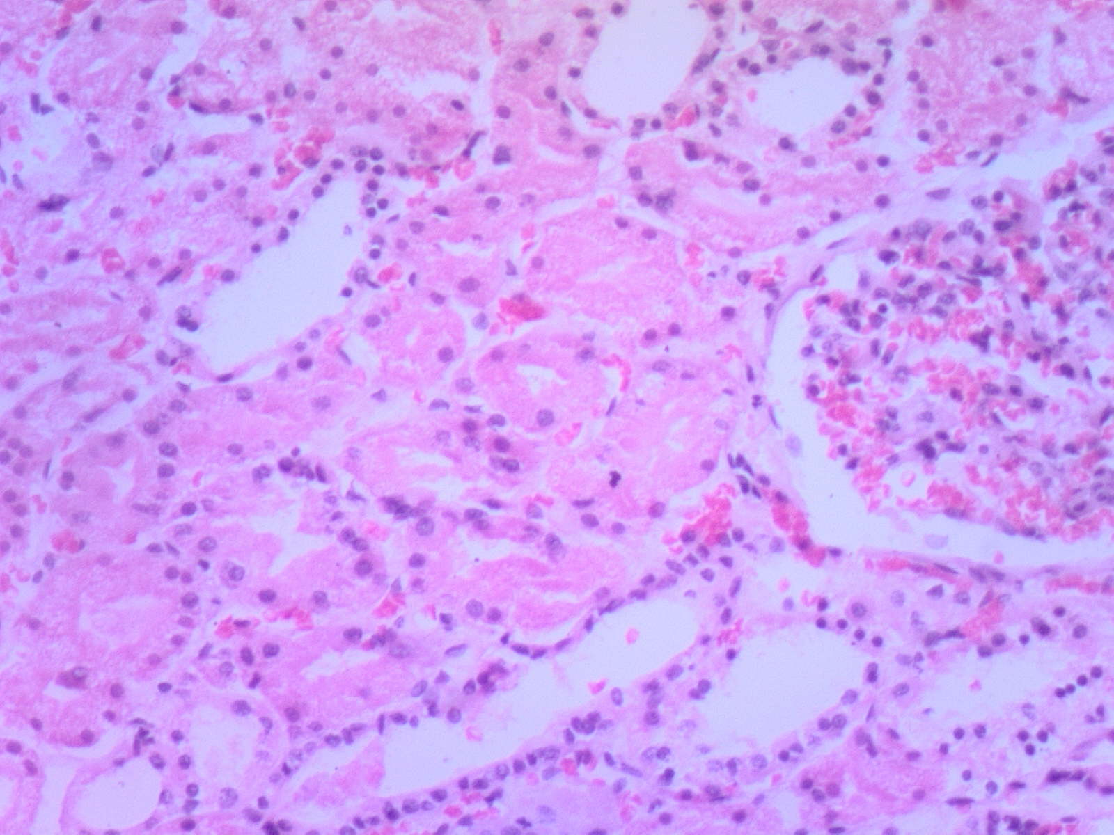 Наибольшие изменения определяются в извитых канальцах первого и второго порядка, расположенных около клубочков. На большем увеличении — цитоплазма эпителиальных клеток содержит мелкие и крупные оксифильные (розовые) зерна. Границы клеток размытые, апикальная часть разрушена, в просвете канальцев оксифильные крупные зерна и глыбки. В одних клетках ядра отсутствуют, в других прослеживаются контуры их, в третьих- ядро сохранено. Эпителиальная выстилка прямых канальцев не изменена, в просвете их встречается оксифильные зернистые и гомогенные цилиндры. Структура клубочков и стромы без особенностей.