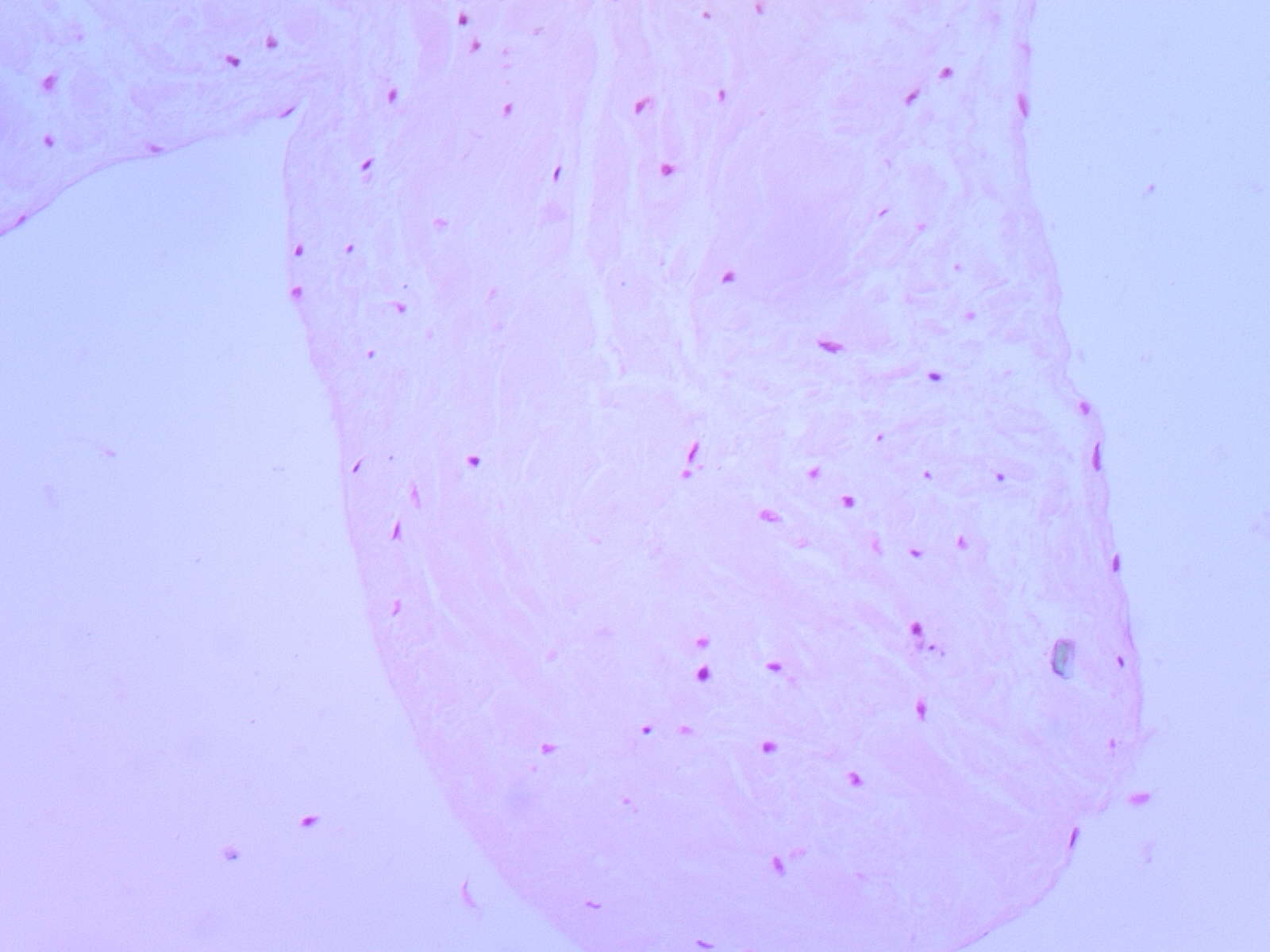 Створка клапана утолщена, рыхлая, набухшая, неравномерно окрашена. Имеются участки бледно-розового и различных оттенков синего цвета - базофилия (мукоидное набухание). При окраске по Хейлу эти участки сине-зеленого цвета, при окраске толуидиновым синим они розово-красного цвета (метахромазия).