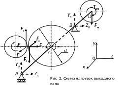 Выполнен проверочный расчёт выходного вала. Схема нагрузок этого вала показана на рис.