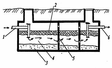 4 - отстойная часть; 5 - перегородки с отверстиями; 6 - выпуск очищенной воды