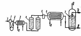 Рис. 13. Схема озонаторной установки: 1, 5 - пылевые фильтры; 2 - воздуходувка; 3 - холодильник; 6 - генератор озона; 7 - барботажная колонна; I - воздух; II - охлаждающая вода; III - очищенная сточная вода; IV - подача сточной воды; V - отработанный воздух