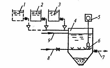 действия: 1 - бак бисульфита натрия; 2 - бак щелочи; 3 - бак кислоты; 4 -