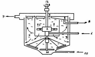 Рис. 15. Схема флотатора: 1 - трубопровод; 2 - распределительное устройство; 3 - кольцевая перегородка; 4 - зона циркуляции; 5 - флотационная зона; 6 - пена; 7 - радиальная пеносборная труба; 8 - скребок; 9, 10 - трубопроводы; 11 - скребковый механизм; 12 - привод