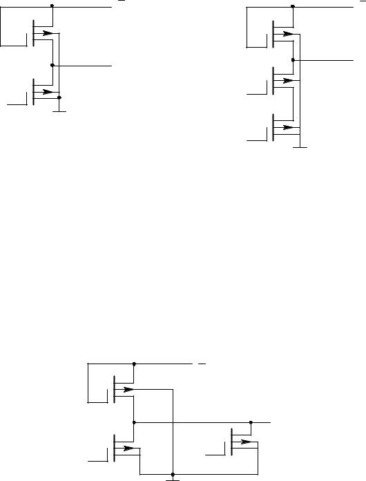 структурах: малая потребляемая мощность, высокая помехоустойчивость, высокое быстродействие. Высокое быстродействие таких схем реализуется за счет того, что в цепях заряда и разряда паразитных емкостей схемы включены малые сопротивления открытых транзисторов. Логические схемы И-НЕ, ИЛИ-НЕ образуются параллельнопоследовательным соединением ключевых транзисторов. На рис. 2.28 представлена схема, реализующая функцию ИЛИ-НЕ, использующая как р-канальные, так и n-канальные транзисторы.