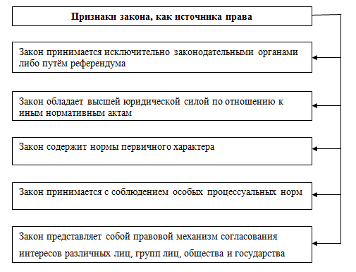 По этой и по ряду других причин в научной и учебной юридической литературе гораздо чаще используется понятие закона в собственном смысле. Главное состоит в том, чтобы понять основной смысл, содержание того, что называется законом, выделить и рассмотреть его основные специфические черты. Обобщая весь материал можно определить следующие специфические черты закона.