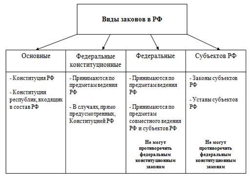 В зависимости от органов, издавших тот или иной закон, а также от территории, на которую распространяется его действие, законы в федеративном государстве подразделяются на федеральные (общефедеральные) и на законы, принятые субъектами федерации. В свою очередь, федеральные законы делятся на федеральные конституционные и федеральные обыкновенные законы. Законы, принятые субъектами Федерации, также подразделяются на конституционные и обыкновенные (текущие). Федеральные законы издаются высшими органами государственной власти Федерации и распространяются на всю ее территорию, остальные - высшими органами государственной власти субъекта Федерации и соответственно распространяют своё действие исключительно на его территории. По общему правилу, в случае расхождения федеральных законов с законами субъектов Федерации первые имеют приоритет над вторыми. Согласно Конституции Российской Федерации “законы и иные нормативные правовые акты субъектов Российской Федерации не могут противоречить федеральным законам”, принятым по предметам исключительного ведения Российской Федерации или по предметам совместного ведения Федерации и ее субъектов. “В случае противоречия между федеральным законом и иным актом, изданным Российской Федерацией, действует федеральный закон” (ч. 5 ст. 76). В случае же противоречия между федеральными законами и нормативно-правовыми актами субъектов Федерации, изданными по предметам исключительного ведения субъектов, “действует нормативный правовой акт субъекта Российской Федерации” (ч. 6 ст. 76).