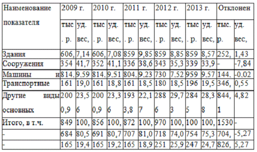 В 2009-2013 гг. снижается доля пассивной части фондов - домов и сооружений (на 6,41% в сравнении с 2009 годом) и повышается доля активной части основных средств, что оценивается позитивно в работе организации, потому что высококачественные и количественные перемены в составе ключевых производственных средств обязаны исполняться в направлении роста интенсивной части средств труда. В данных целях в организации нужно будет совершать мероприятия, обеспечивающие технические, организационные и финансовые преобразования.