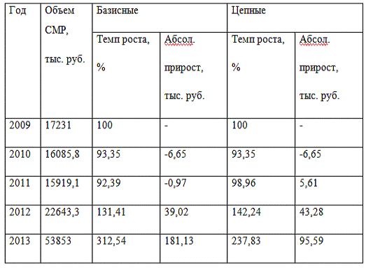 В общем за 5 лет объем выполняемых строительно-монтажных работ увеличился на 36622 тысяч рублей или же на 212,54%, при всем при этом среднегодовой темп прироста составил - 42,5%.