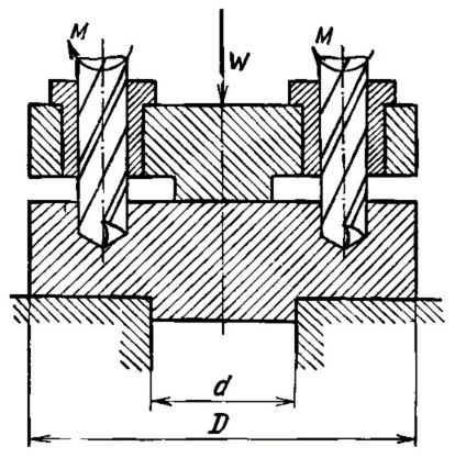 В процессе обработки отверстия обрабатываемая заготовка находится под воздействием крутящего момента М и осевого усилия Ро. Сила подачи и сила зажима действуют в одном направлении, прижимая заготовку. Под действием крутящего момента резания М деталь стремится повернуться вокруг оси. Этому противодействует момент трения Мтр, создаваемый осевым усилием зажима W.