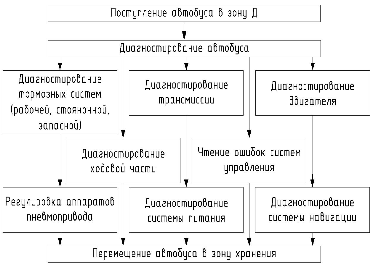 Схема укрупненного технологического процесса диагностики автобусов, позволяющая представить возможные пути движения при проведении диагностики представлена на рисунке 4.3.