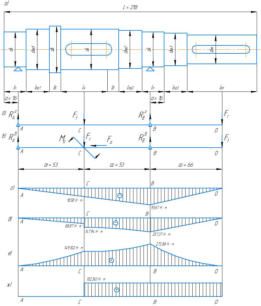 Проектирование вала: а ‒ эскиз вала; б ‒ расчетная схема в горизонтальной плоскости; в ‒ расчетная схема в вертикальной плоскости; г ‒ эпюра изгибающих моментов в горизонтальной плоскости; д ‒ эпюра изгибающих моментов в вертикальной плоскости; е ‒ эпюра суммарных изгибающих моментов; ж ‒ эпюра вращающих моментов.