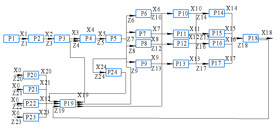 б) все блоки обозначаются Pi, входы Zi, выходы Хi;