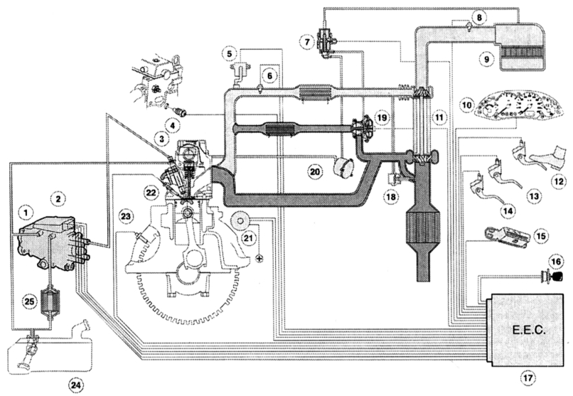1— Распределительный топливный насос, 2 — блок управления насосом (PCU), 3 — форсунка, 4 — температурный датчик головки блока цилиндров (СНТ), 5 — датчик абсолютного давления во впускном трубопроводе (МАР), 6 — датчик температуры впускного воздуха (IAT), 7 — регулятор пониженного давления EGR, 8 — датчик температуры впускного воздуха (IAT) перед турбонагнетателем, 9 — воздушный фильтр, 10 — комбинированный инструмент, 11 — турбонагнетатель Garett-GT15, 12 — датчик педали акселератора (АР), 13 — датчик положения педали сцепления (СРР), 14 — выключатель тормозного освещения (ВРР), 15 — диагностический разъем (DLC), 16 — замок-выключатель зажигания,17 — блок управления трансмиссией (HCV) EEC V с 104 кодами и встроенным PATS, 18 — клапан турбонагнетателя,19 — клапан рециркуляции отработанного газа (EGR) c EGR-установочным датчиком, 20 — вакуумный насос, 21 — зарядное устройство аккумуляторной батареи (Smart-Charging), 22 — штифтовые свечи накаливаниz,23 -Позиционный датчик коленчатого вала (СКР), 24 — топливный бак, 25 — топливный фильтр.