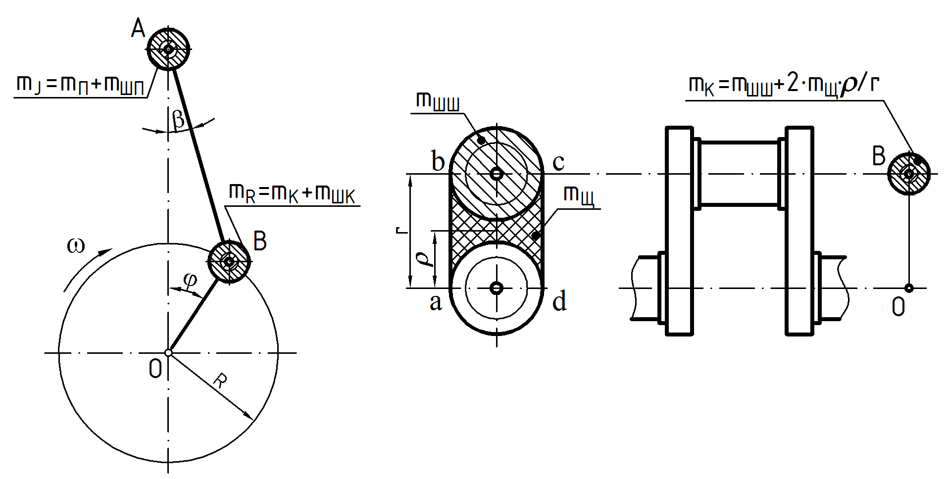 Для упрощения динамического расчета действительный КШМ заменяется эквивалентной системой сосредоточенных масс (рисунок 4.2), которая состоит из массы mJ, совершающей возвратно-поступательное движение и сосредоточенной в точке А, и массы mR, совершающей вращательное движение и сосредоточенной в точке В.