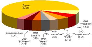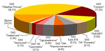 При этом в структуре совокупных торгов на двух российских фондовых биржевых площадках - ОАО ММВБ-РТС и ОАО «Санкт-Петербургская биржа» основной объем операций приходился на акции небольшого числа сырьевых компаний и кредитных организаций.