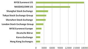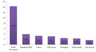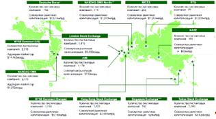 Фундаментальными тенденциями развития мирового организованного рынка ценных бумаг являются глобализация рынка, постепенное организационно-технологическое объединение бирж и роста на этой основе капитализации крупнейших мировых торговых площадок (см. табл. 3).