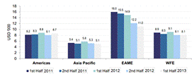 Международные биржи способствуют преодолению все еще не завершившегося международного финансово-экономического кризиса, о чем свидетельствует сохранение средней стоимости сделок на биржах регионов мира (см. рис. 8).