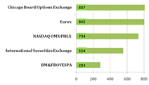 Рисунок 11.- Количество опционных контрактов на крупнейших биржах мира, млн.