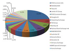 Таблица 5. - Объем торгов акциями и число их эмитентов на мировых биржах на 31.12. 2013 года