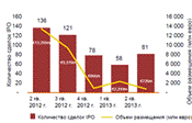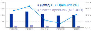Рисунок 29. - Финансовые результаты NYSE Euronext за 5 кварталов 2012 - 2013 годов, млн. долл., %.