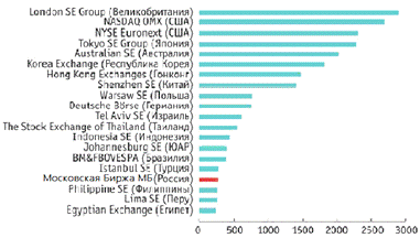 Российская фондовая биржа занимает 20 место в мире по объему операций.