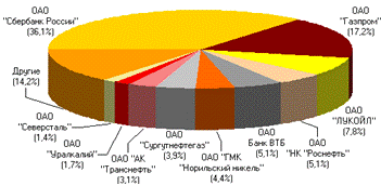Российский организованный рынок ценных бумаг сильно монополизирован. Операции с долевыми бумагами десяти первых по капитализации эмитентов российского рынка ценных бумаг обеспечивают чуть меньше 86% всего торгового оборота фондовой секции Московской биржи (см. рис. 3 и 4).