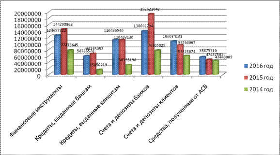 В пассивной части баланса лидирующие позиции на 1 января 2017 года занимают статьи «Счета и депозиты банков» (44,98%) и «Счета и депозиты клиентов» (34,39%). Это означает, что политика банков считает ключевым моментом не только выдачу кредитов, но и размещение у себя вкладов и депозитов не только физических и юридических лиц, но и кредитных организаций. Доля счетов и депозитов банков с 2014 по 2015 год увеличилась с 76805829 до 192621042 тыс. руб. (на 150,79%), но с 2015 по 2016 уменьшилась на 53928248 тыс. руб. (на 28%) и составила 138692794 тыс. руб. Сумма счетов и депозитов клиентов увеличилась на 57,72% к концу 2015 года (с 59323674 до 93563067 тыс. руб.) и еще на 12471065 тыс. руб. (13,33%) к концу 2016 года и составила 106034132 тыс. руб. Однако, есть еще одна важная статья для кредитной организации «Средства, полученные от АСВ» (Агентства по страхованию вкладов). Выплаты от АСВ в период с 2014 по 2015 год увеличились на 4014492 тыс. руб. (9,24%) и еще на 8418215 тыс. руб. (17,74%) в период с 2015 по 2016 год и в итоге статья «Средства, полученные от АСВ» составила 55875716 тыс. руб. Все прочие статьи баланса «Финансовые инструменты», «Выпущенные долговые ценные бумаги», «Обязательства, предназначенные для продажи», «Субординированные займы», «Обязательства по отложенному налогу на прибыль» и «Прочие обязательства» не превышают 0,29% в удельном весе и обладают значительно меньшей долей, чем вклады, депозиты и средства, полученные от Агентства по страхованию вкладов. Фокус кредитной организации в период с 2014 по 2016 год был сделан на привлечение средств во вклады и депозиты.