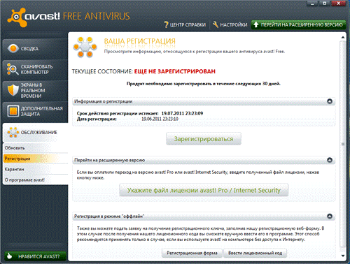 В разделе «Регистрация» указывается состояние регистрации и, если Avast! Free Antivirus 6 зарегистрирован, сроки окончания регистрации. Бесплатная лицензия выдается на год, после чего можно получить новую. Также в этом окне можно указать файл лицензии для перехода на одну из платных версий антивируса Avast!